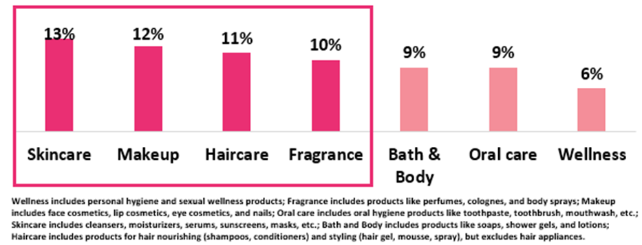 Nykaa Beauty Trends Report 2024에 따르면, 인도의 뷰티 및 퍼스널케어 산업은 △스킨케어 △모발케어 △메이크업 △향수 △베스 & 바디(Bath&Body) △웰니스 △구강케어 등 7개 핵심 분야로 구성되어 있으며, 이 중 스킨케어, 메이크업, 모발케어, 향수 부문이 성장을 주도하고 있다.