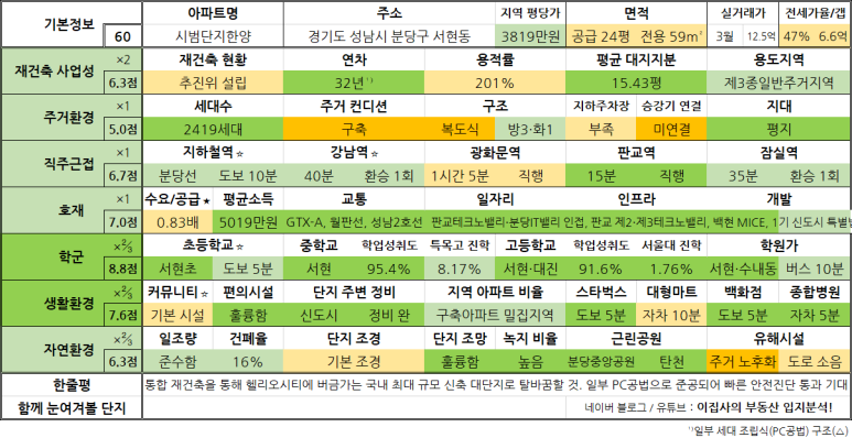 - PC공법으로 지어진 역세권 대단지라는 점에서 분당 내에서도 높은 재건축 우선순위 기대. 뛰어난 생활 편의성과 더불어 단지내 흐르는 여수천이 매력적인 단지